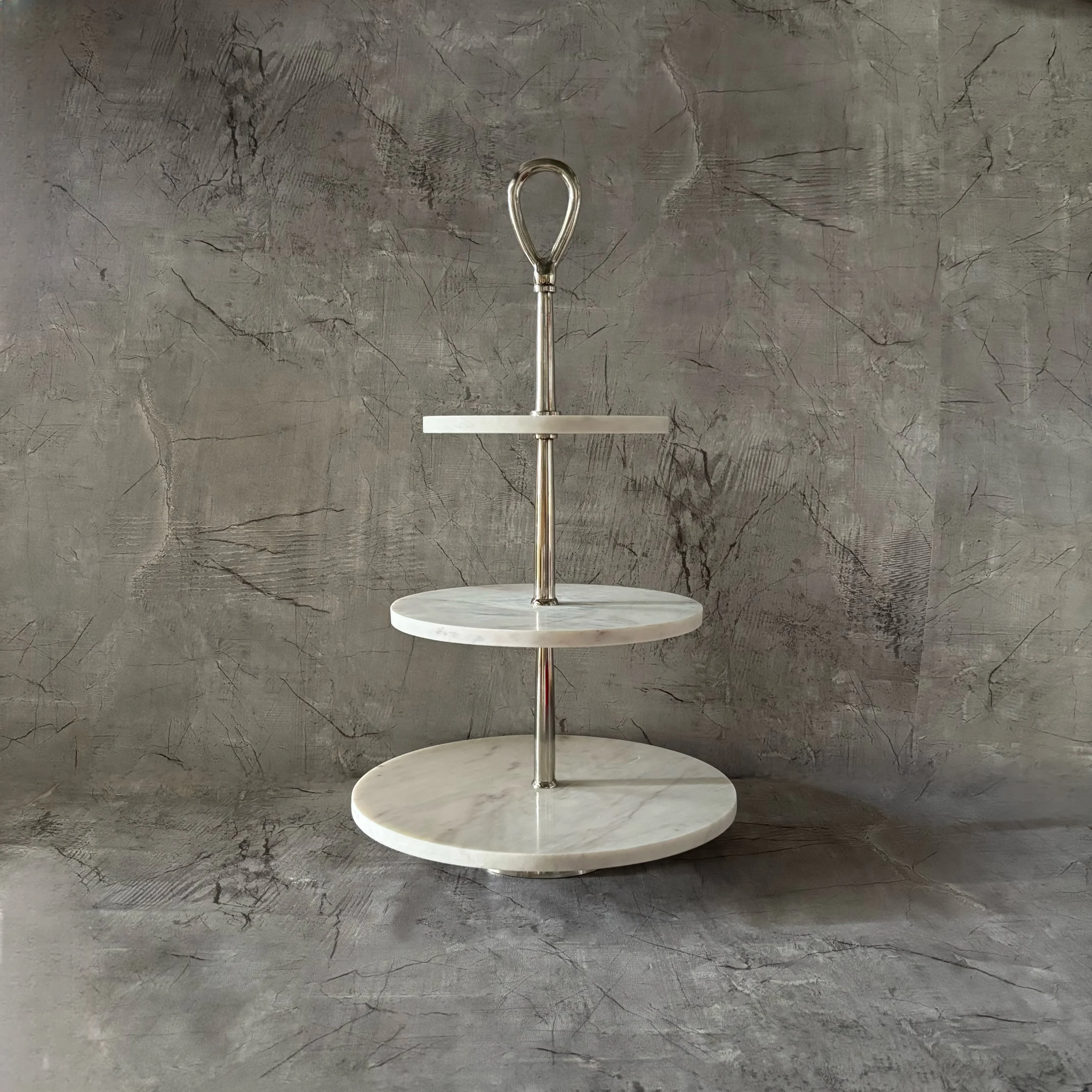 Con tres niveles diseñados para exhibir tus postres, aperitivos o decoraciones de manera elegante, esta torre complementa de manera perfecta esos rincones dulces dentro del evento. Su base sólida en mármol blanco, con delicadas vetas naturales, crea una armoniosa combinación de belleza y funcionalidad.